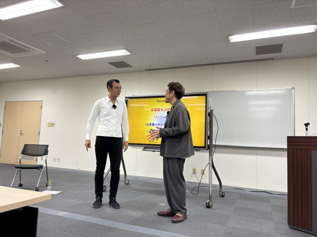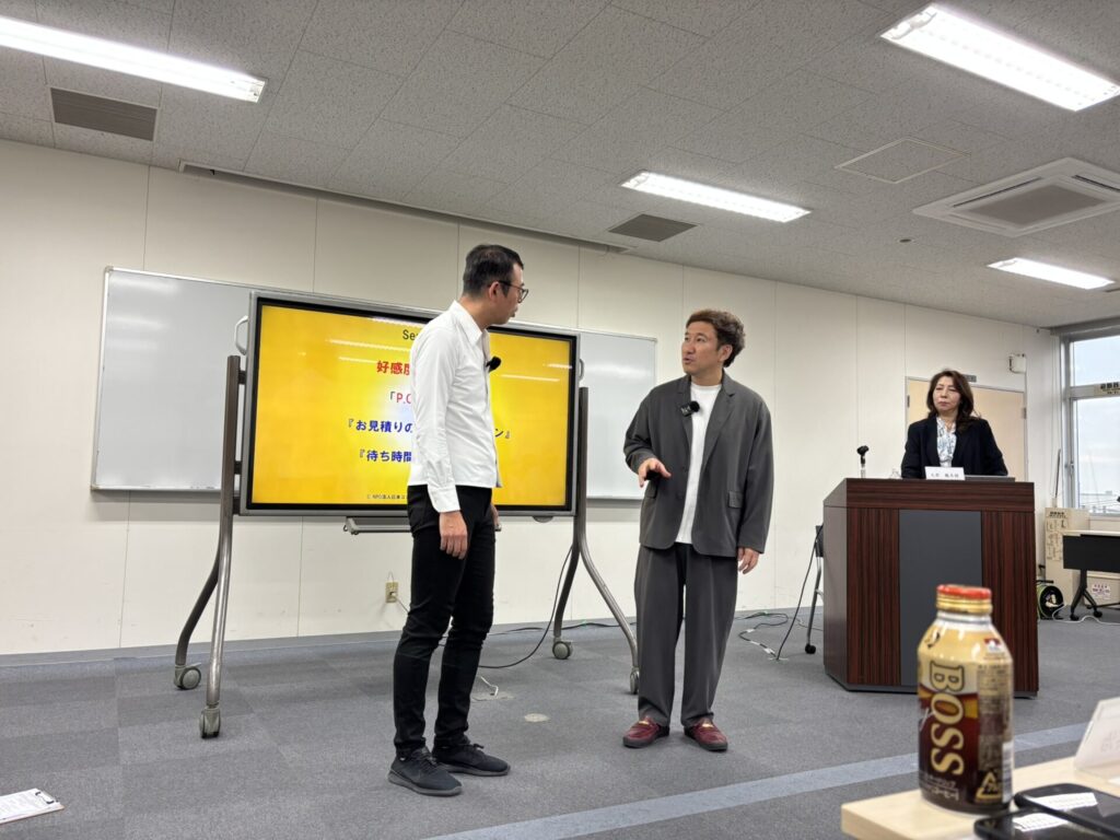研修の目玉は、ジョイマンのお二人による 「悪い接客の実演」。 実際の現場で起こりがちなNG対応を、あえて“笑い”を交えて再現することで、受講者は